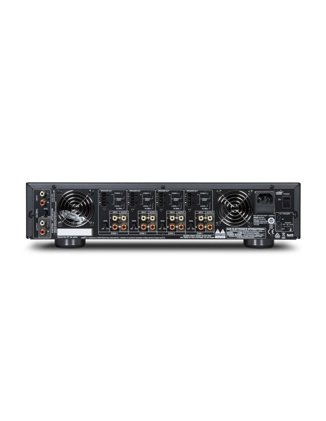 - Ocho canales de energía limpia y de baja distorsión en una configuración de cuatro zonas estéreo.