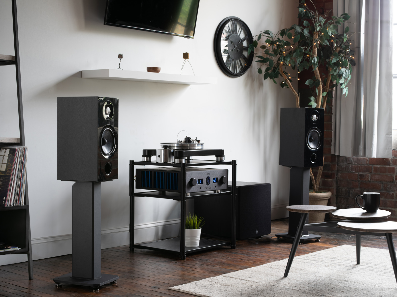 La altura de 22 pulgadas (55,9 cm) está diseñada para colocar los altavoces a la altura óptima de los oídos cuando se está sentado, mejorando la imagen estéreo y la claridad del sonido.